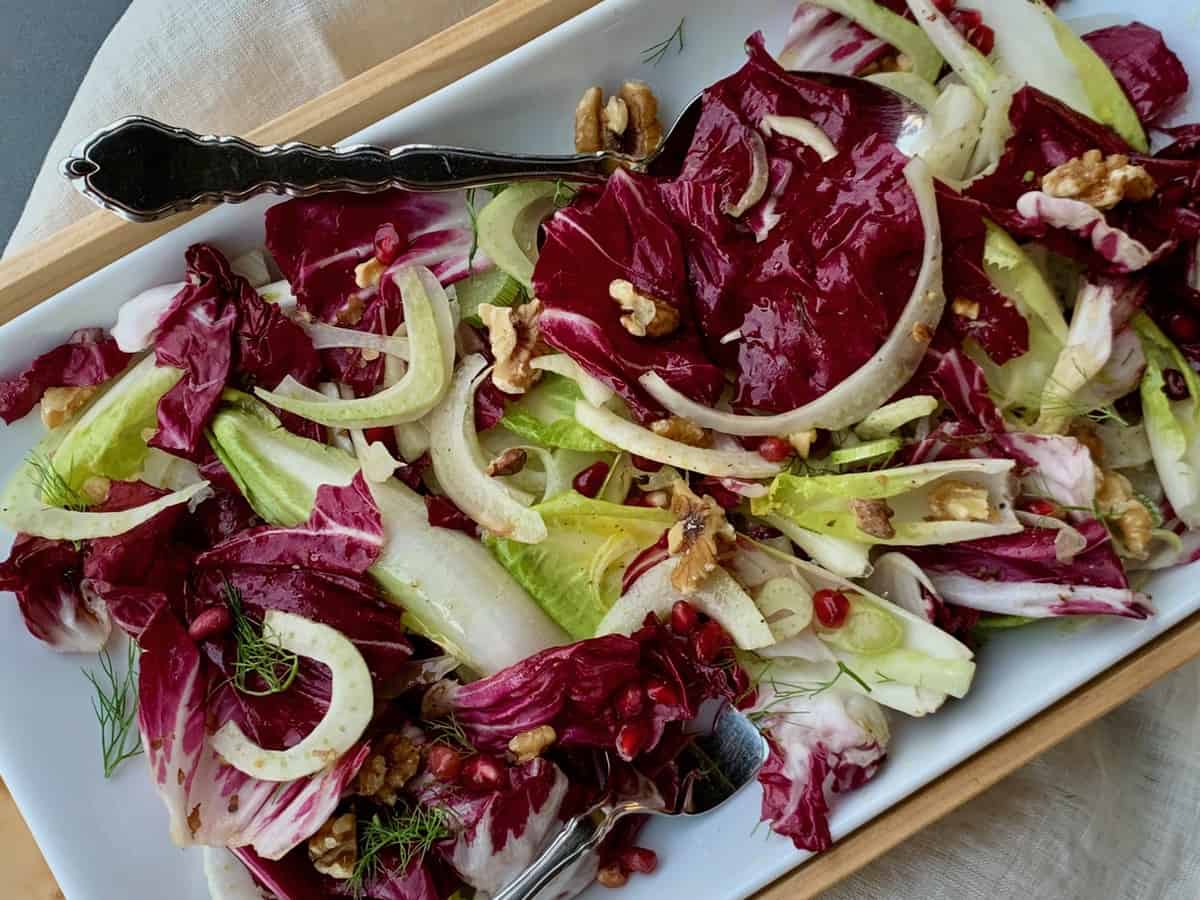 Combine chicory with fennel, radicchio, pomegranate seeds and toasted walnuts. Sprinkle with course salt and pepper.